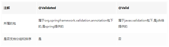 需要搭配在Controller中搭配@Validated或@Valid注解一起使用,@Validated和@Valid注解区别不是很大,一般情况下任选一个即可,区别如下: