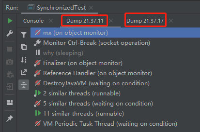 这一次,两个线程都在 TIMED_WAITING 状态,都在 sleeping。说明都拿到了锁,进入了业务逻辑。