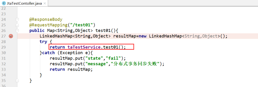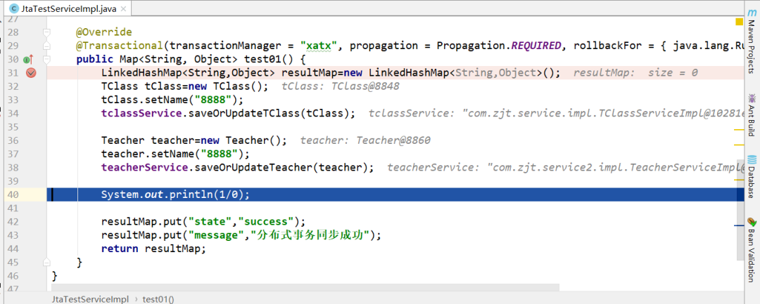 实现先后操作两个数据源:然后我们可以自己debug跟踪事务的提交时机,此外,也可以在在两个方法全执行结束之后,手动制造一个运行时异常,来检查分布式事务是否全部回滚;