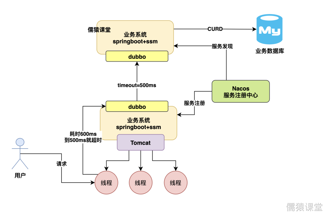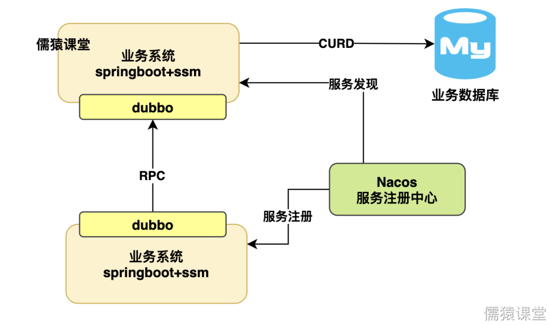 首先,我们还是先引出一个话题,那就是平时我们开发的系统是什么样的?其实往简单了说,就是用 SpringBoot+SSM 开发一套业务代码,然后用 Nacos+Dubbo 去 RPC 调用别的系统。