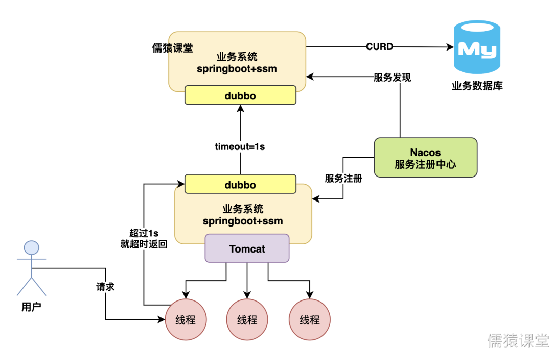 所以说,往往来说,我们对于别的服务 RPC 调用一般都得设置一个超时时间,比如说,设置 timeout=1s,那么意思就是说,我们调用别的系统如果超过 1s 没有响应,就直接抛个异常就返回了,这样就可以避免我们的 Tomcat 线程 长时间阻塞了。