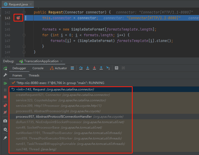 先看一下 org.apache.catalina.connector.Request 是怎么来的,老规矩,构造方法上打断点: