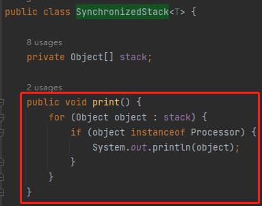 但是你按照我这样去写的时候会发现:RecycledProcessors 的父类,也就是 SynchronizedStack 类并没有提供 print 方法,怎么办呢?