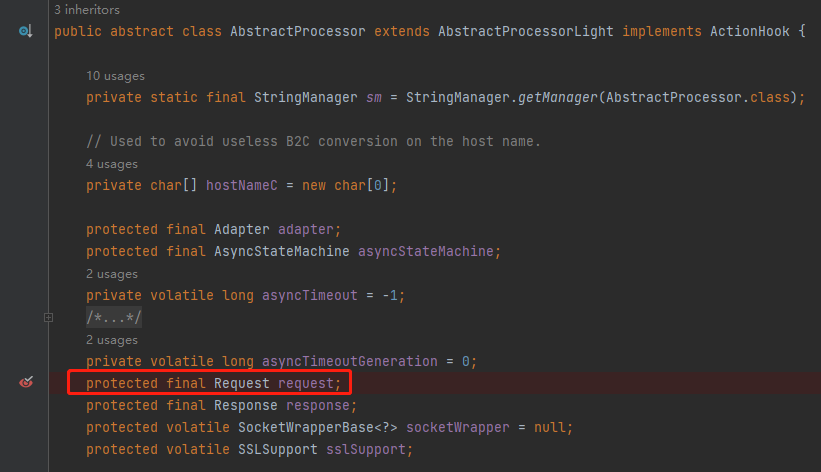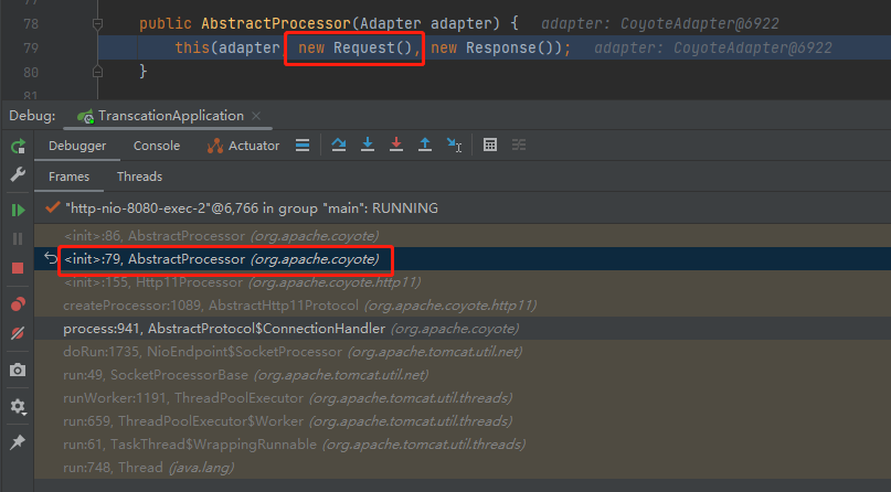 重启项目,发起请求,发现 Debug 停在了 AbstractProcessor 类的构造方法,这就是 request 最开始产生的地方,同时我们又收获了一个调用堆栈: