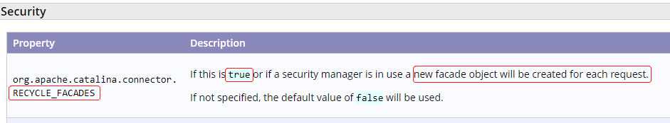 意思是 RECYCLE_FACADES 这个参数控制着是否循环使用 facade 这个对象,如果设置为 true 会提高安全性,而这个参数默认是 false。