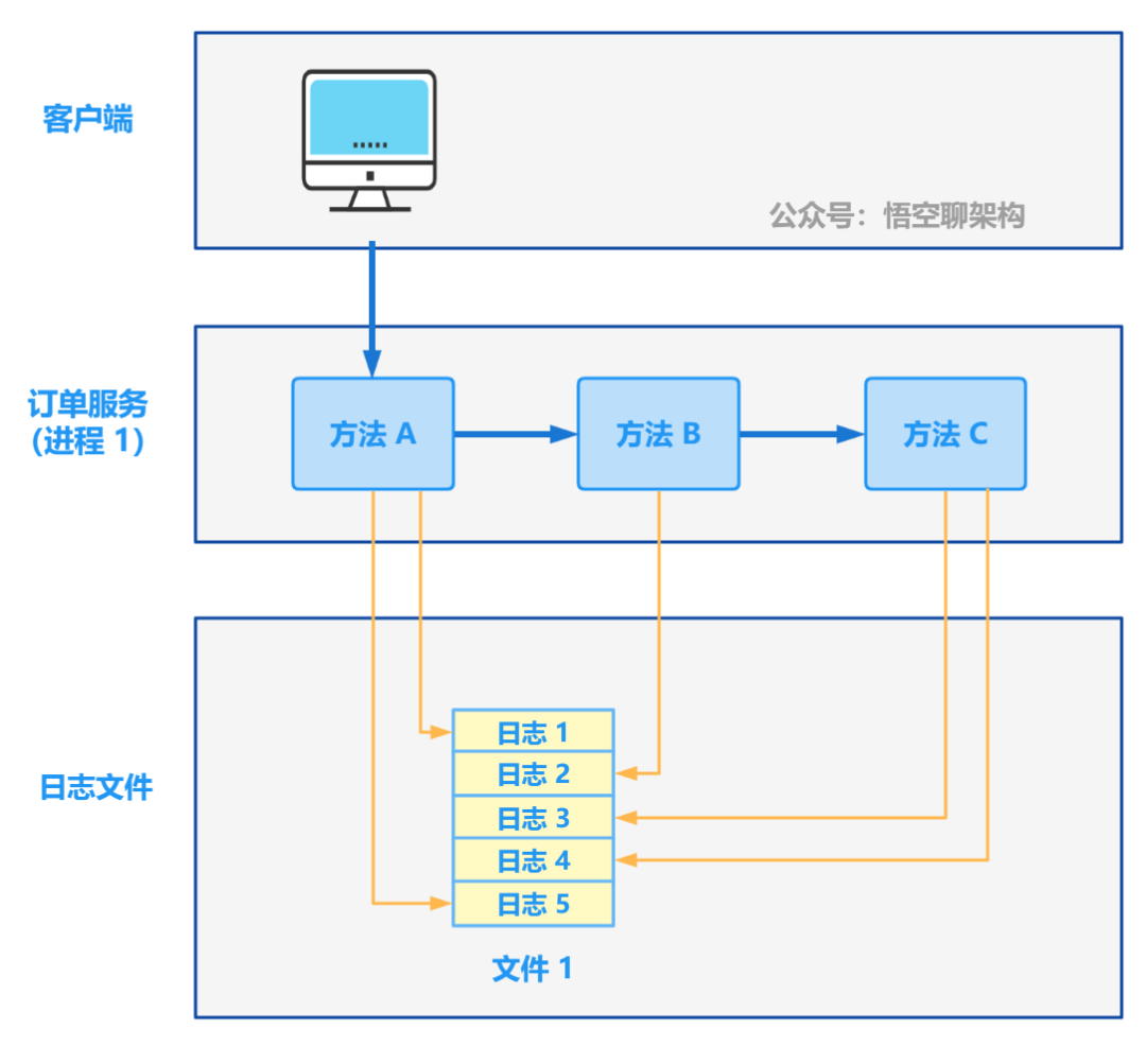 方法 A 将日志打印到日志文件 1 中,记录了 5 条日志。方法 D 将日志打印到日志文件 2 中,记录了 5 条日志。但是这 10 条日志是无法关联起来的。