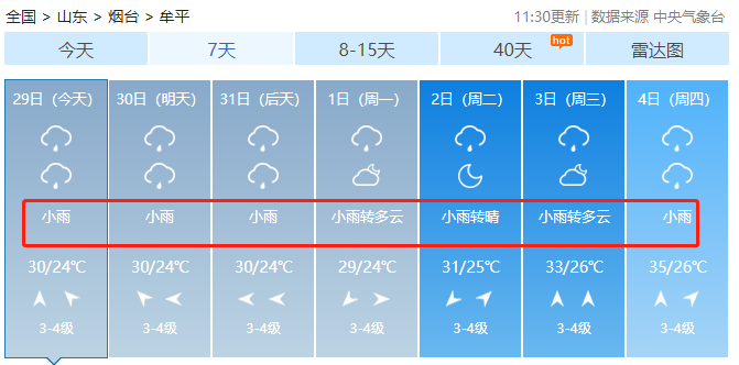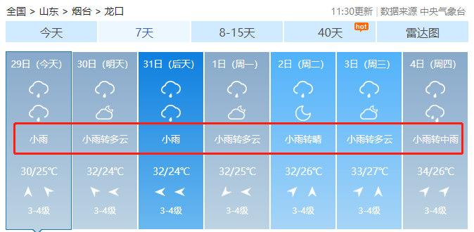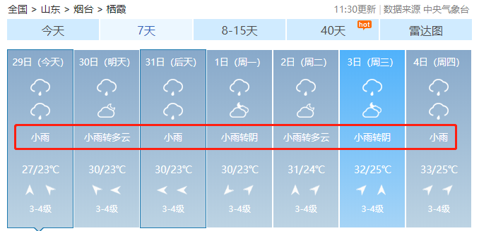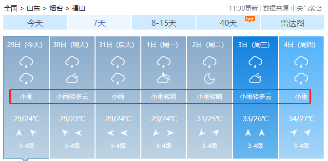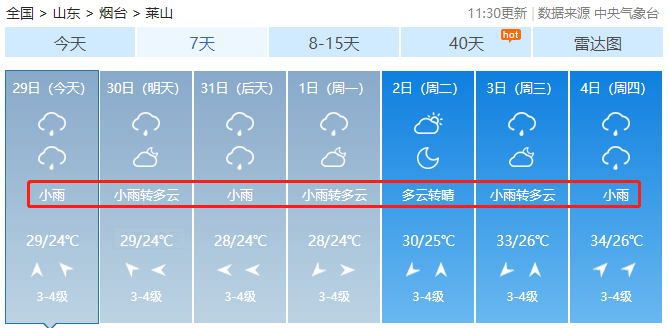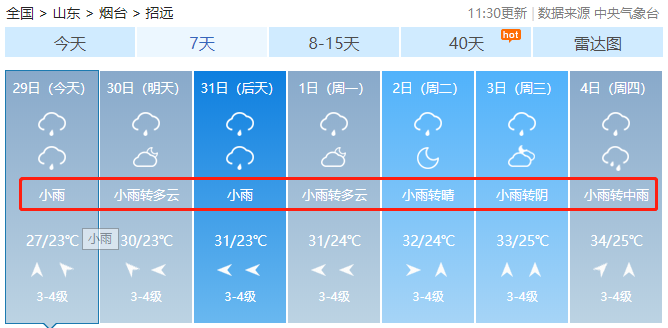 29日下午到30日白天,泰安、济宁、枣庄和临沂天气阴有小到中雨局部大雨和暴雨并伴有雷电,其他地区多云间阴有雷雨或阵雨。东营、淄博、潍坊、临沂、日照和半岛地区南风3~4级,其他地区北风转南风3~4级,雷雨地区雷雨时阵风7~9级。