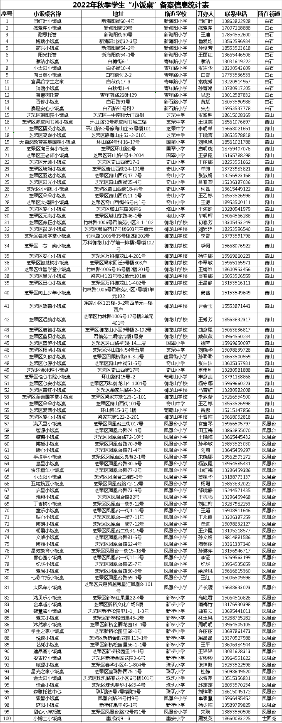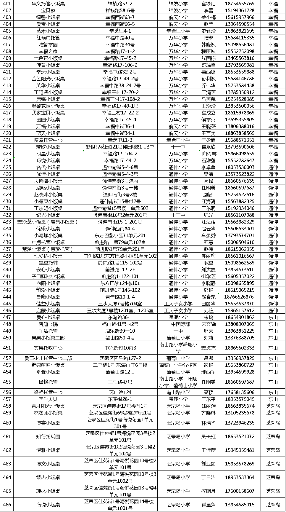 经过芝罘区市场监管局、全区各街道办事处的协同合作,目前芝罘区共有466家学生“小饭桌”通过了疫情防控和食品安全双核验。现将符合条件准许开业的学生“小饭桌”名单予以公示,供市民朋友进行选择,具体名单如下: