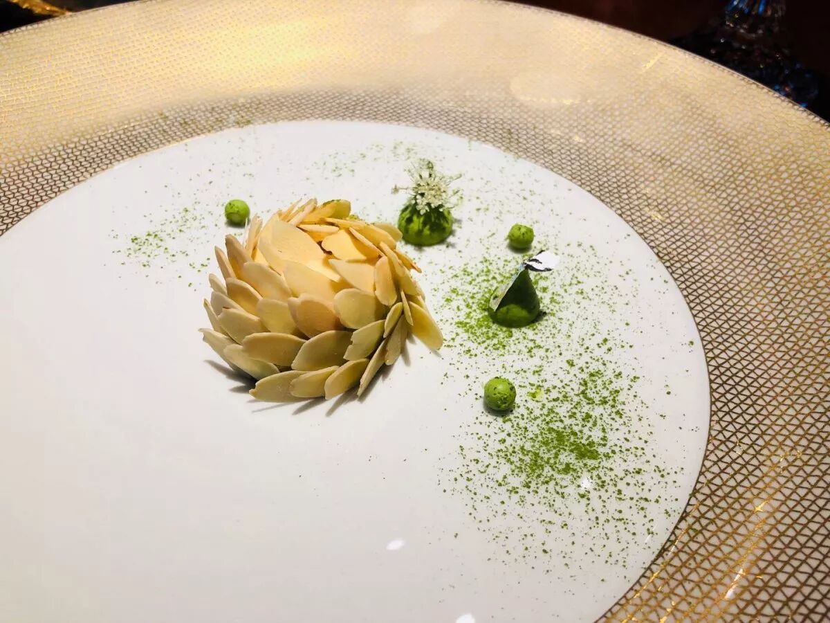 The tasting began with a light, subdued, and crunchy L’amande Fleurissent, literally almond flower, a name which informs its arrangement of a soft nougat filling beneath a shell of roasted almond slices, creamy bites of Kyoto matcha mousse, and a sliver of silver foil.