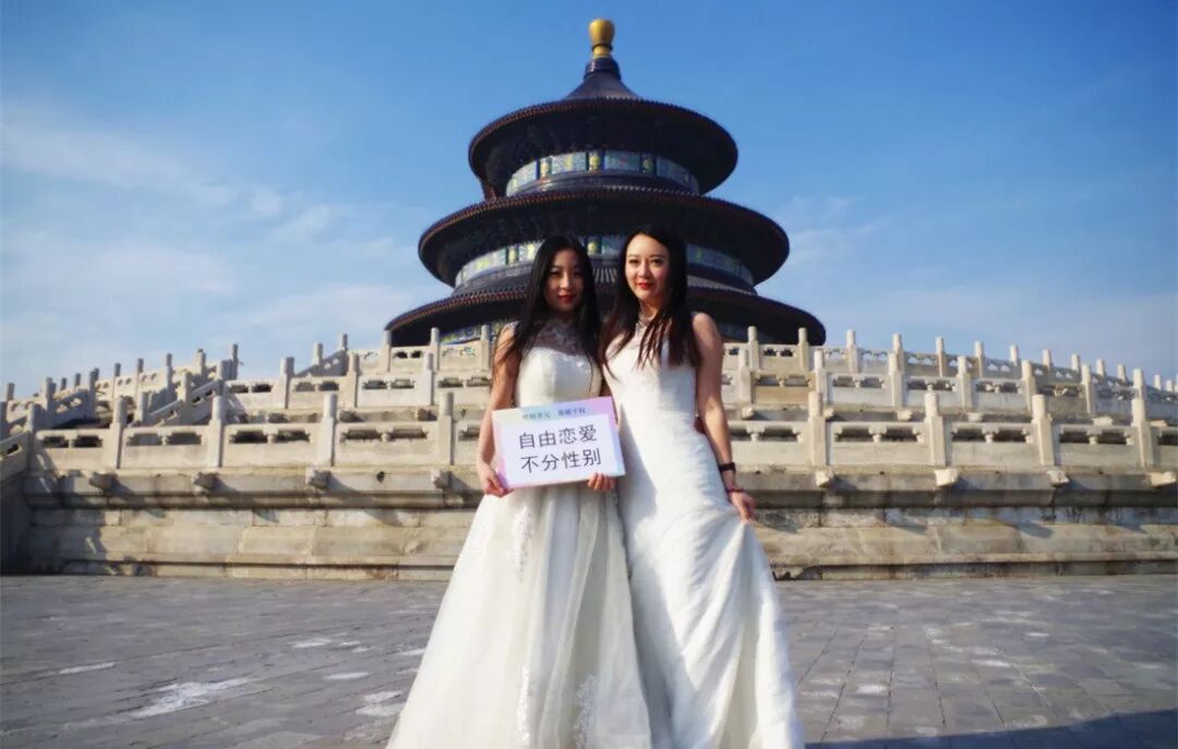 A lesbian couple pose for a photo with the slogan "free love isn't defined by gender" in front of the Temple of Heaven