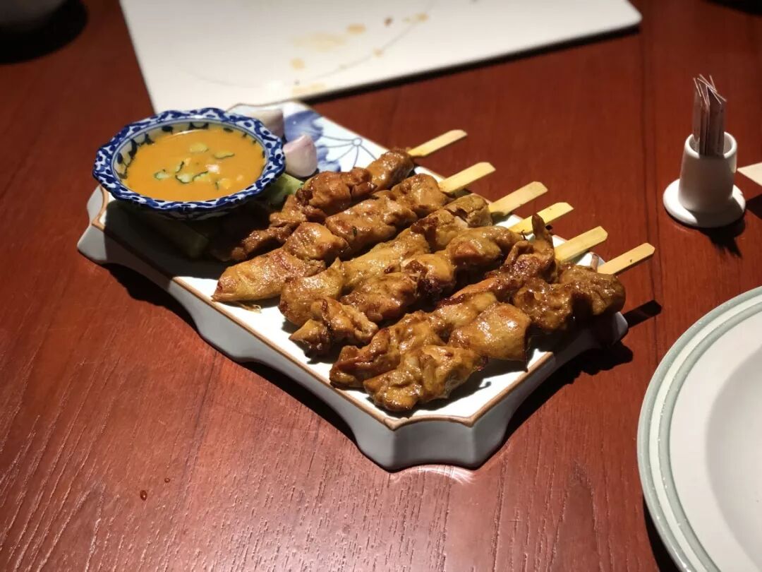 crunchy shrimp spring rolls (RMB 58 for eight) and satay chicken or beef