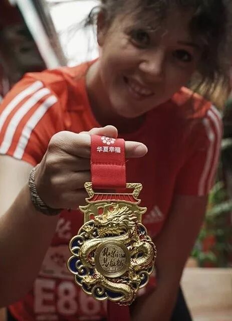 Gonet shows off her Finishers medal of the 2019 Beijing Marathon