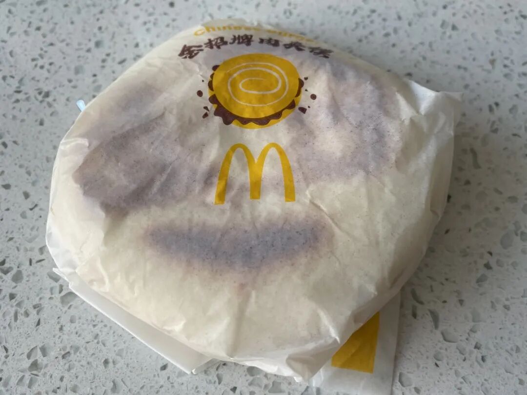 14 minutes and 52 seconds later, the order arrived. Like other McDonald's breakfast sandwiches, it comes wrapped only in wax paper – no unnecessary cardboard box, thumbs up for that. Unlike other limited-run menu items, which often just use wrappings for existing products, it comes in a specially-labeled Chinese Burger 金招牌肉夹馍 wrapper.