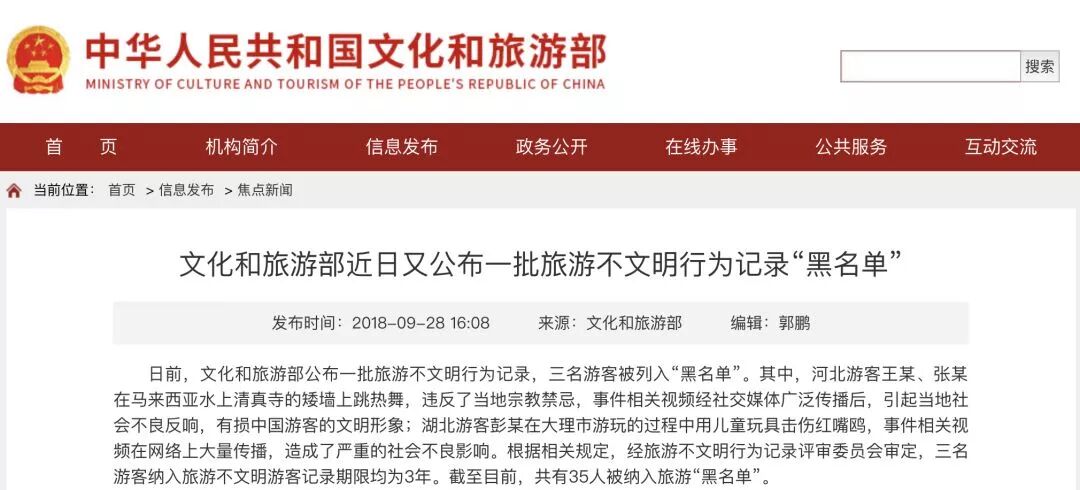 文化和旅游部根据相关规定,将三名游客纳入旅游不文明游客记录,期限均为3年。截至目前,全国共有35人被纳入旅游“黑名单”。