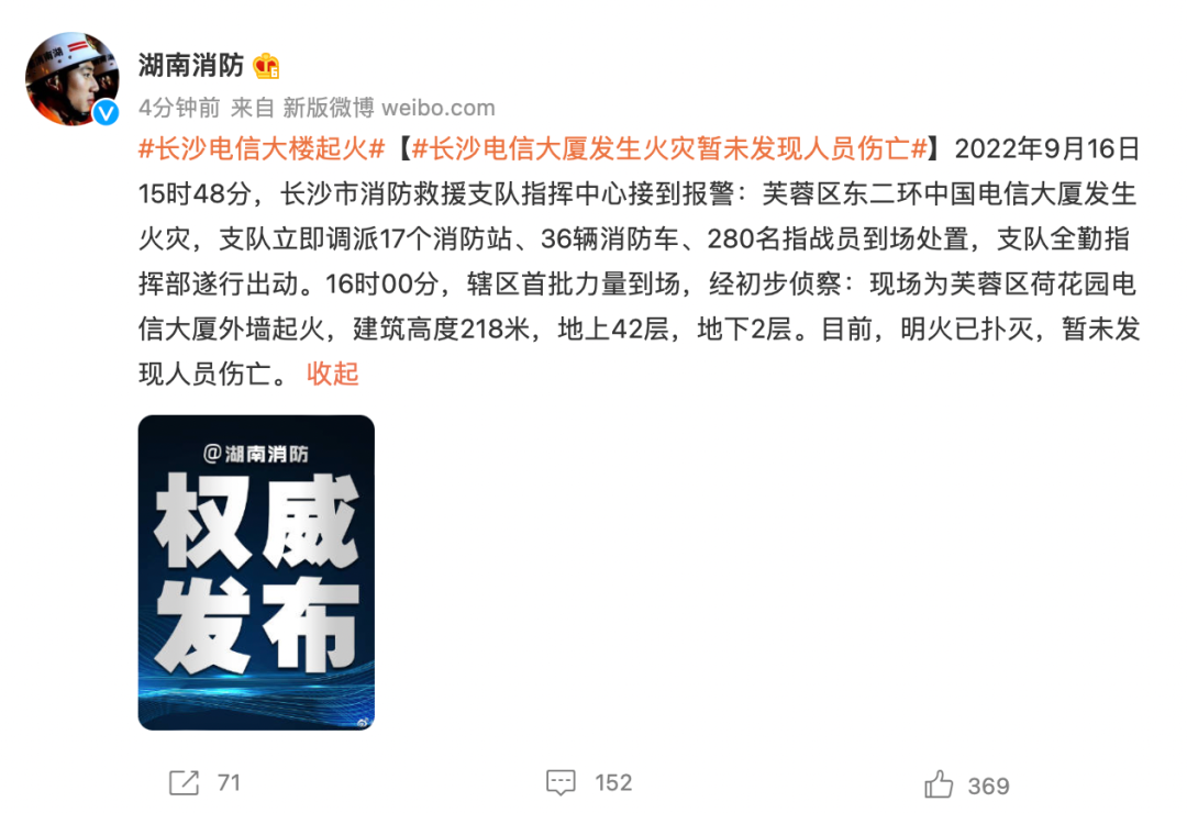 据了解,事发电信大楼2000年建成,位于长沙市东二环,曾以218米的高度成为长沙首座突破200米的楼宇。具体火灾伤亡情况正在进一步了解中。另据湖南省消防救援总队通报,9月16日15时48分,长沙市消防救援支队指挥中心接到报警:芙蓉区东二环中国电信大厦发生火灾,支队立即调派17个消防站、36辆消防车、280名指战员到场处置,支队全勤指挥部遂行出动。16时00分,辖区首批力量到场,经初步侦察:现场为芙蓉区荷花园电信大厦外墙起火,建筑高度218米,地上42层,地下2层。目前,明火已扑灭,暂未发现人员伤亡。