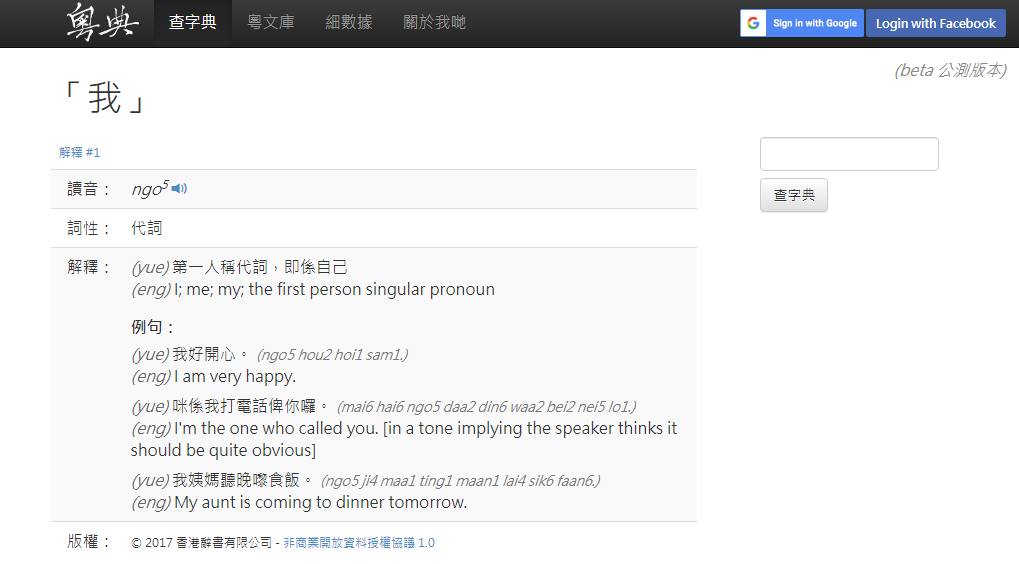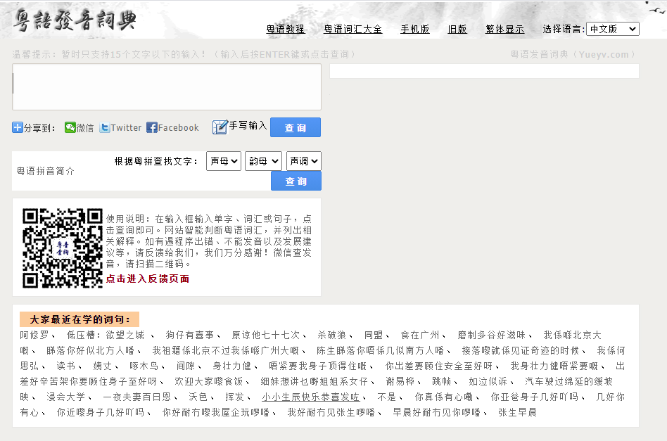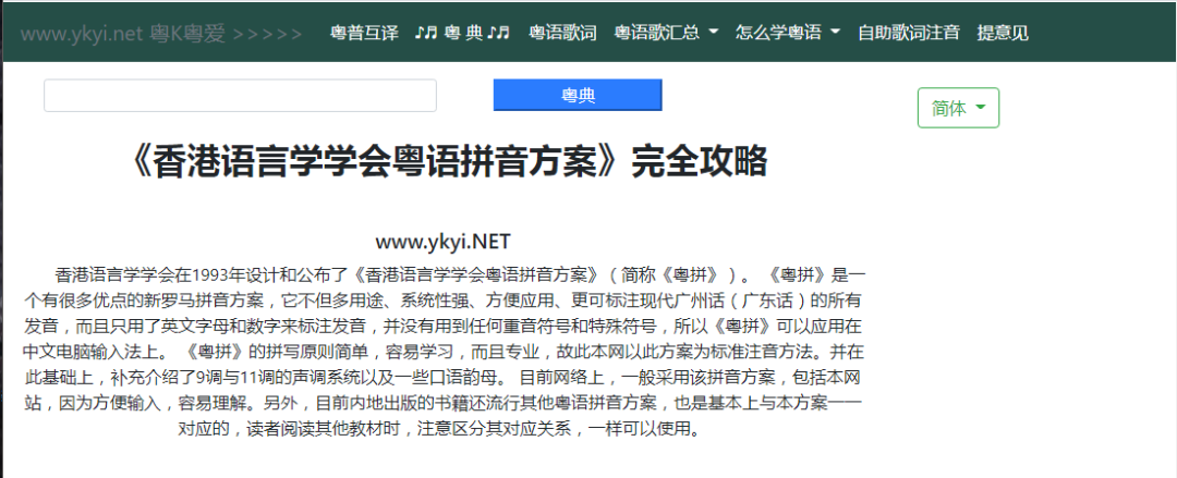 同时,这个网站是个多功能网站,除了粤拼教程,还有粤语普通话互译、粤典和歌曲粤拼注音等等。