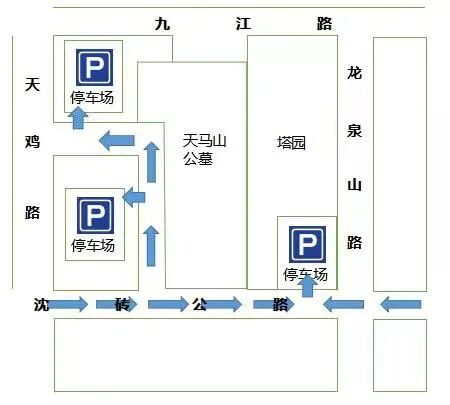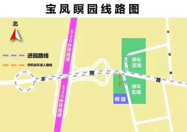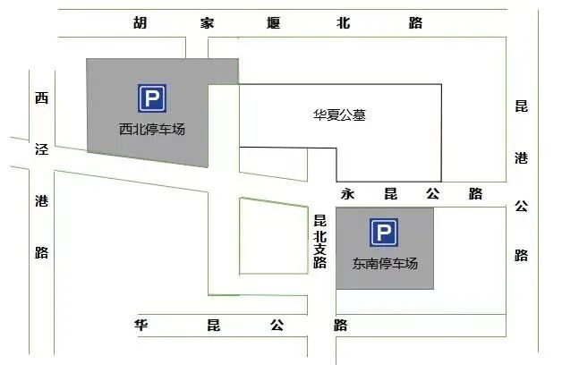 扫墓车辆沿墨玉北路—汇旺路—外钱路进入墓园各停车场停放,出墓园车辆沿外钱路北向南行驶至望安路、墨玉北路、百安路。