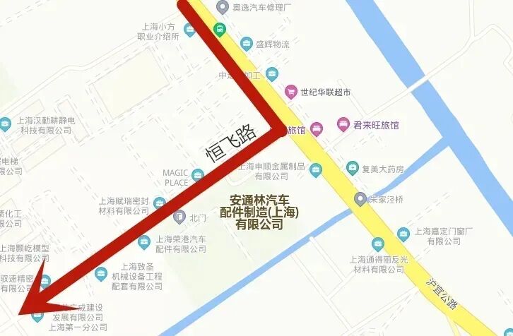 市区及虹桥地区:嘉闵高架真南路下匝道—沪宜翔江路口顺车掉头—沪宜公路—翔乐路。