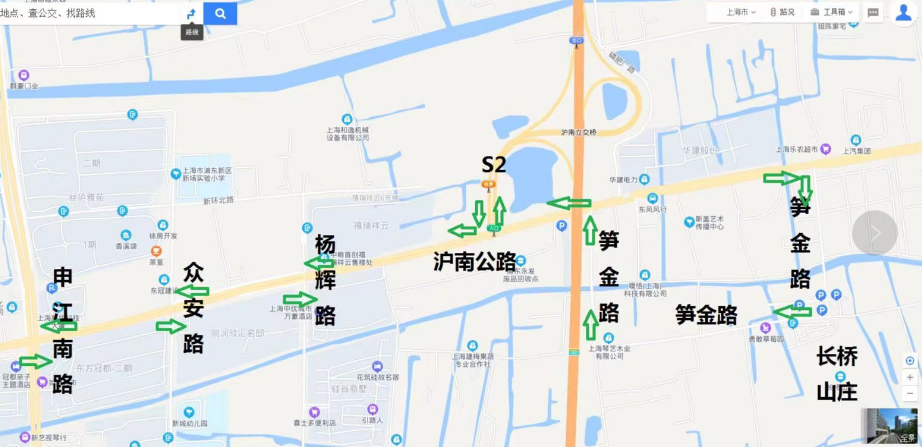 外环高速→沪芦高速→沪南立交桥→右转进入沪南公路西向东行驶,至前方沪南/杨辉、沪南/众安,或沪南/申江南路口顺车掉头,沿沪南公路东向西前行至沪南/笋金路口后,进入马蹄形的笋金路。