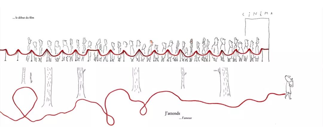 小山薰堂分享的主题是《幸福的策划术》,在一开始,他先是给我们分享了一本来自法国作家大衛.卡利(Davide Cali)的绘本《MOI J’ATTENDS》(中文译名《我等待》),这本插画书中,Davide Cali用一根红线,串联起一个男孩子一生每个重要时刻的等待的场景,从垂髫,到耄耋,从初生牛犊,到两鬓如霜。