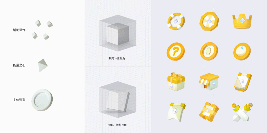 考虑到UI界面的通用性,避免3D材质的喧宾夺主,材质风格以简单通用为主,颜色以界面主色调为基础,漫射材质多营造轻黏土的通用质感;针对能量石的材质,则采用光感通透的玻璃材质。