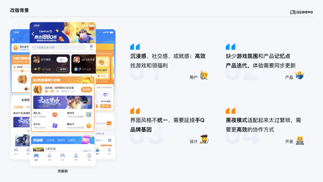 QQ游戏中心是手Q用户触达游戏的重要场景,每天有海量用户来此进行游戏相关的互动操作,随着产品的功能迭代,体验的逐步更新,用户对QQ游戏中心也有着更多更强的诉求。