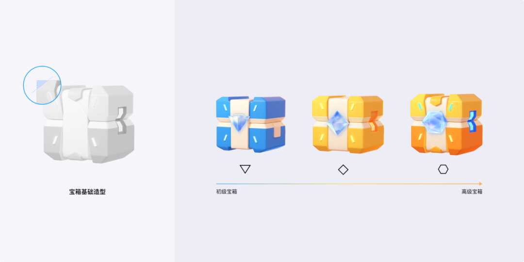 为契合概念的设定和后续的延展,我们把宝石定义为能量石。在能量石的设计上,特意营造出能量充盈、光感琉璃的视觉感受,造型上采用多面切割结构,色彩上兼容蓝色和黄色两种色调,以匹配游戏中心的整体界面风格。