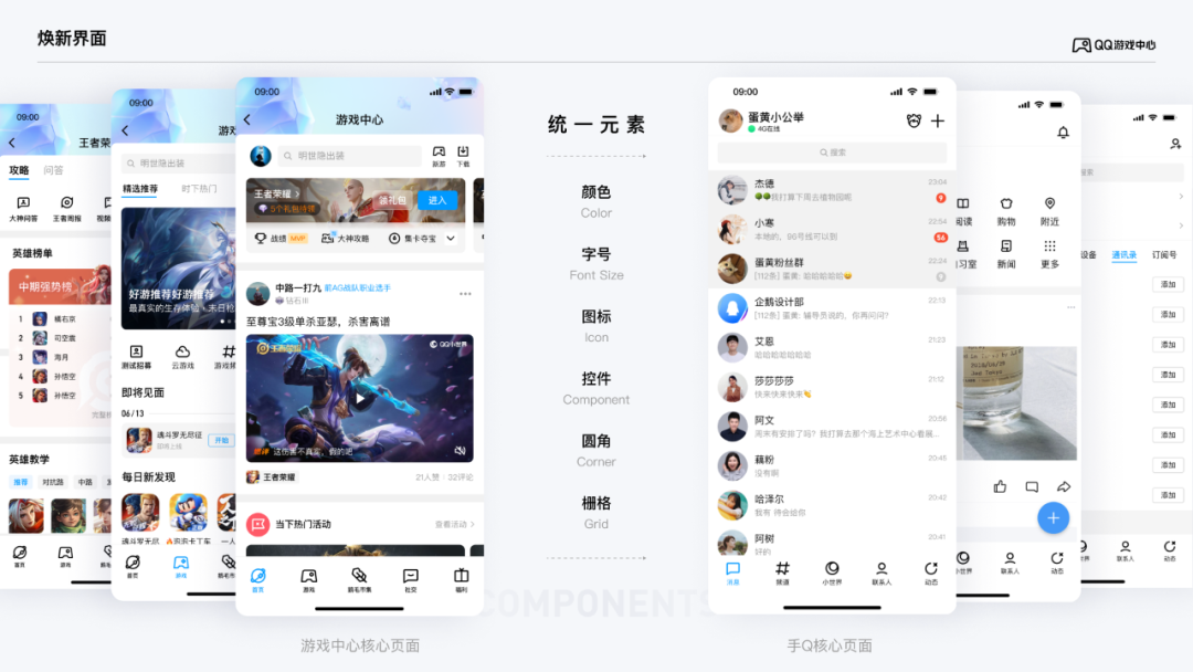 以往的游戏中心,采用更为丰富多彩的设计语言,导致从手Q进到游戏中心较为强烈的割裂感。而本次改版中延续手Q的简约透气的风格表现,通过色彩样式、组件、圆角等设计要素将界面进行规范统一,保证体验的一致性。