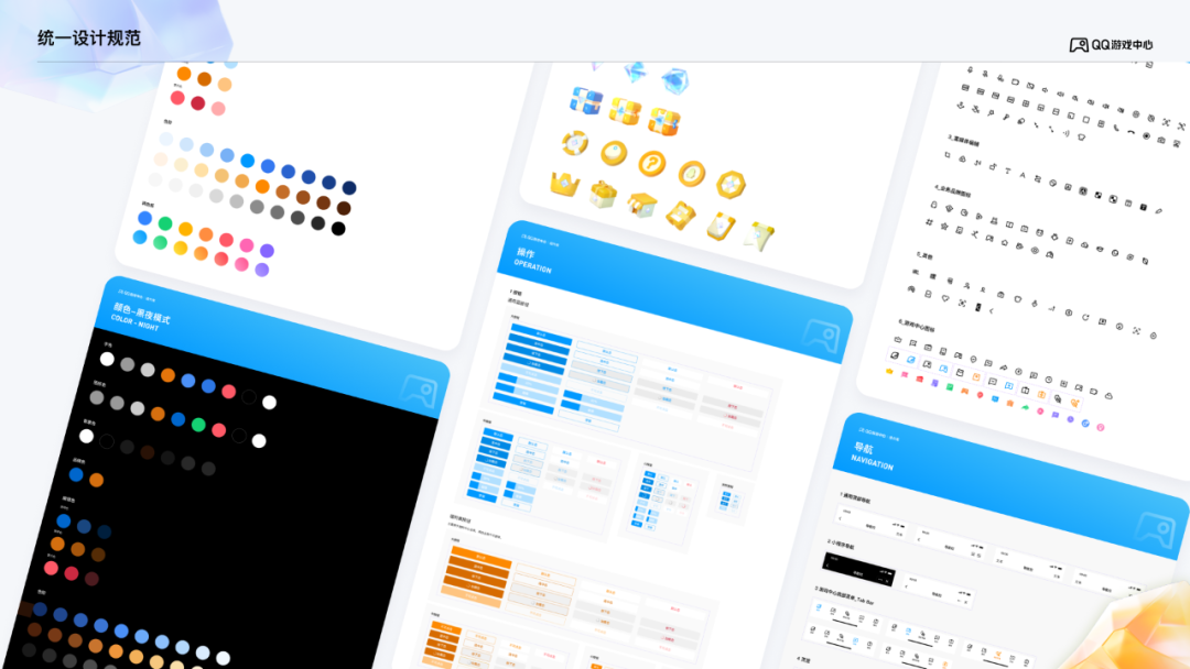 界面的基础样式和控件,和手Q基本规范保持一致,包括颜色、图标风格、基础控件、圆角、栅格等。同时基于业务的诉求,我们在手Q基础上拉出一条规范支线用于游戏中心的设计——主要在基础色、图标等拓展了更多样式。