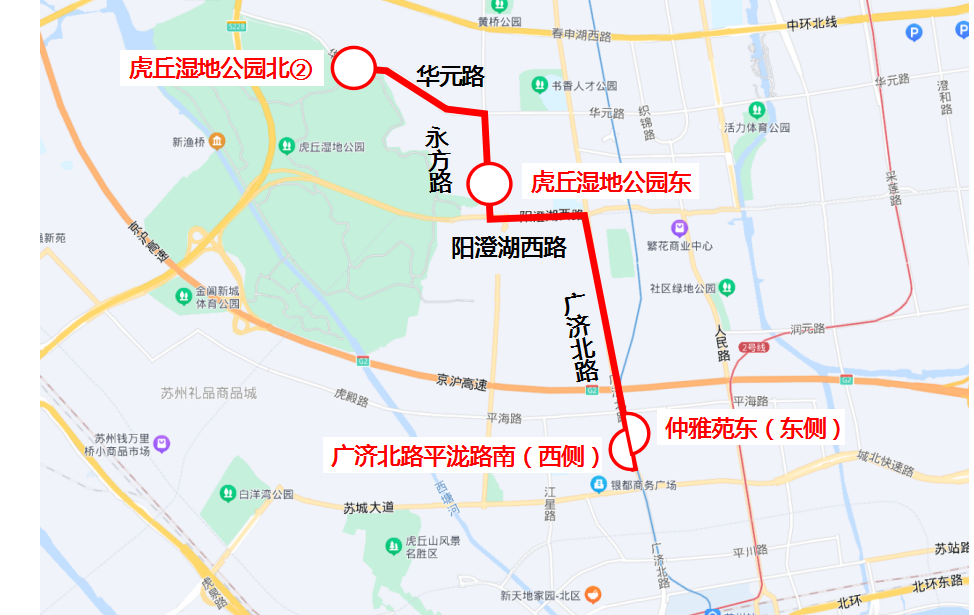 (上行)虎丘湿地公园北②→华元路→永方路→阳澄湖西路→广济北路→广济北路平泷路南(西侧)。