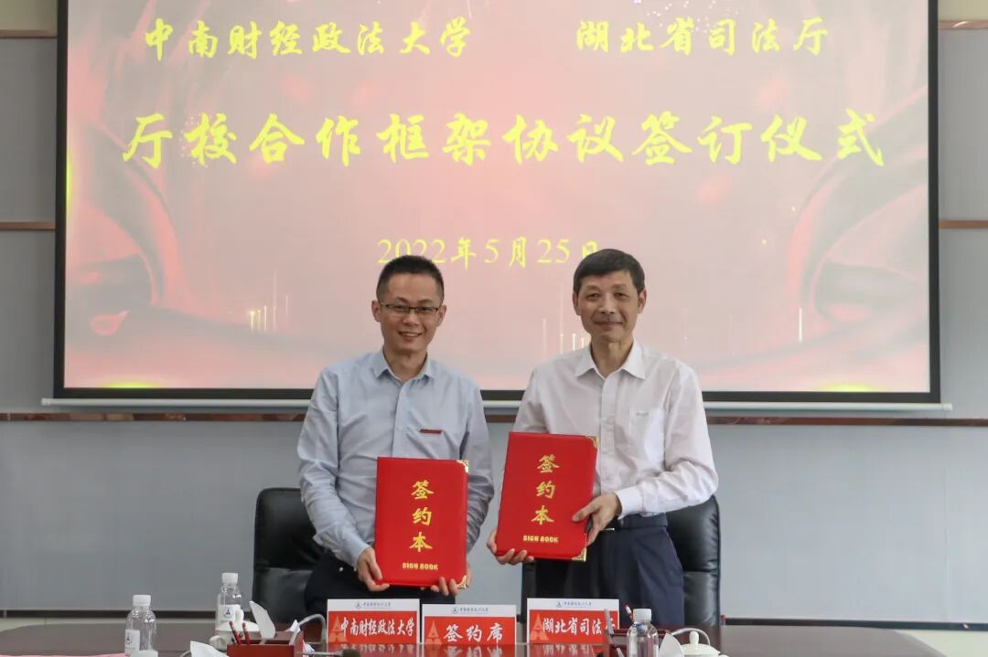 为深入贯彻落实习近平法治思想,加快推进全面依法治省目标的实现,5月25日下午,我校与湖北省司法厅在中原楼五楼会议室举行签订仪式,双方共同签署了厅校合作框架协议。湖北省司法厅党委书记、厅长龚举文,党委委员、政治(警务)部主任杨木根,政治(警务)部组织培训处处长严安、副处长顾丹,我校党委书记栾永玉,党委常委、副校长姚莉,法学院院长陈柏峰、党委书记张学平、党委副书记李晓,律师与公证学院执行院长王永强等出席签订仪式。仪式由姚莉主持。