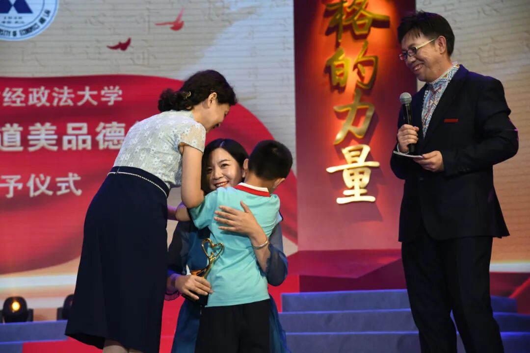 ▲徐江带着“二宝”为培养自己两个孩子的刘红梅颁奖并拥抱