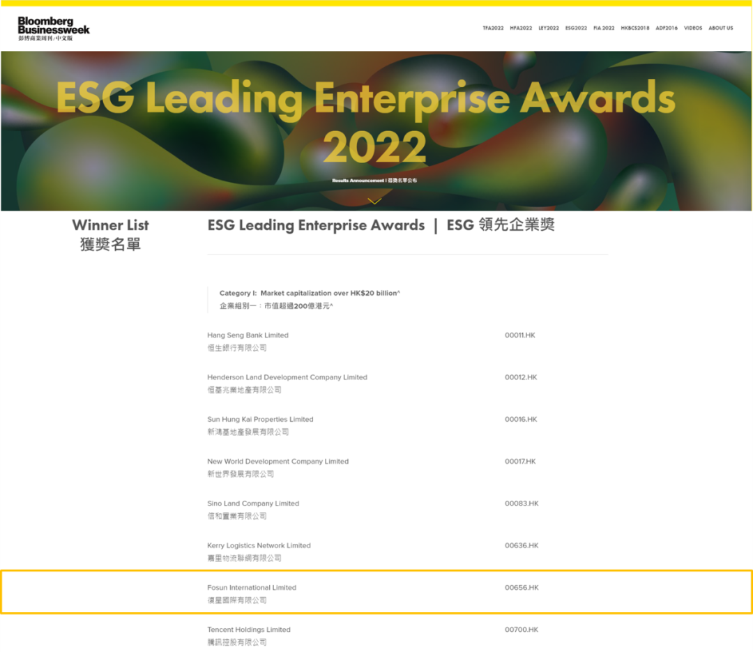 此次复星国际荣获的《彭博商业周刊/中文版》颁发的“ESG 领先企业大奖-市值200亿港元以上”大奖,体现了市场对复星国际在环境、社会及管治(ESG)、企业可持续发展、信息披露等各方面的认可。此次荣获“ESG领先企业大奖-市值200亿港元以上”大奖的公司,还包括香港大型上市企业,如恒生银行、恒基兆业地产、新鸿基地产、新世界发展、信和置业等。