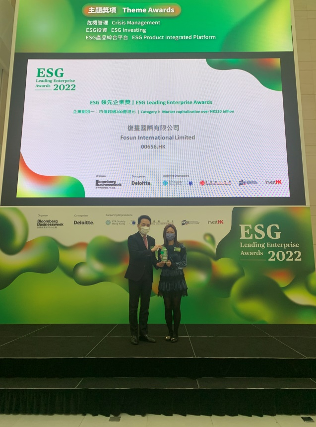 2022年12月14日,由《彭博商业周刊/中文版》主办、全球最大会计师事务所之一的德勤协办、香港特区政府辖下投资推广署、香港银行学会、香港证券及投资学会、CFA Society Hong Kong支持的第四届“ESG 领先企业大奖 2022”(ESG Leading Enterprise Awards 2022)于12月12日举行颁奖典礼公布各奖项结果。复星国际荣获了“ESG 领先企业大奖-市值200亿港元以上”及“ESG 领先社区项目奖”。