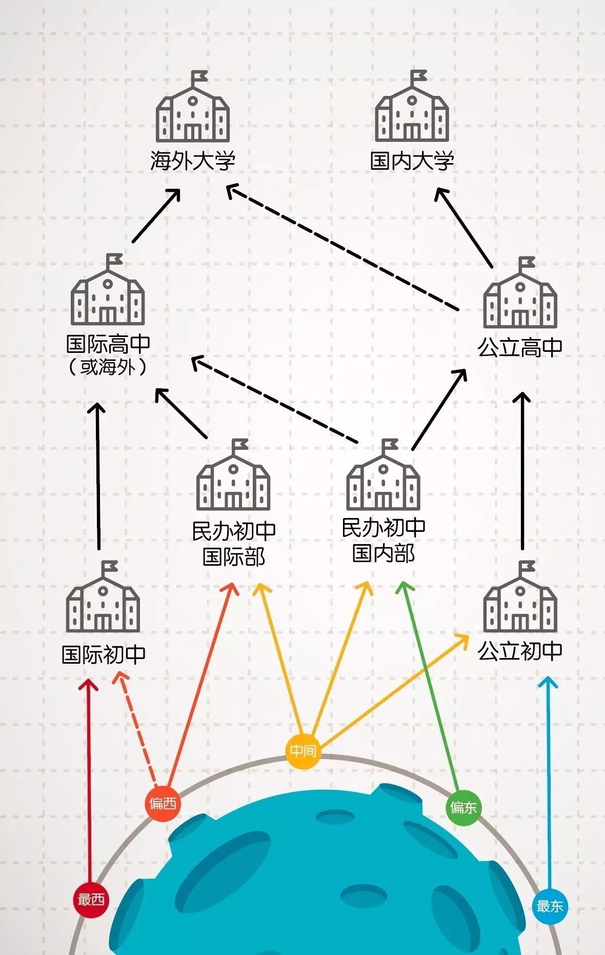 偏东:基本上非常认可中式教育。竞争心理较强。不一定接受刻板公立教育,喜欢“加强版”的中式教育,比如表面民办双语但实际上是比较打鸡血的公立模式。初中喜欢上民办中学(因为在上海民办初中实力明显强于公立初中)。这条光谱出来的孩子也可能会在大学本科时从重点公立高中出国留学。但其一路是比较本土的中国竞争思维。很多“牛娃”、“学霸”都出自于此。