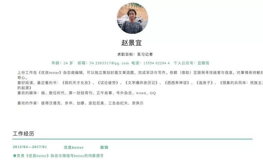北京找工作时制作的简历。一直没找到合适的头像,用了妹妹赵景宇 15 年 7 月在清迈帮我拍的照片。那趟旅行后,我正式来到 better 工作。所以,我修改了入职时间,希望看起来“工作了久一点”。