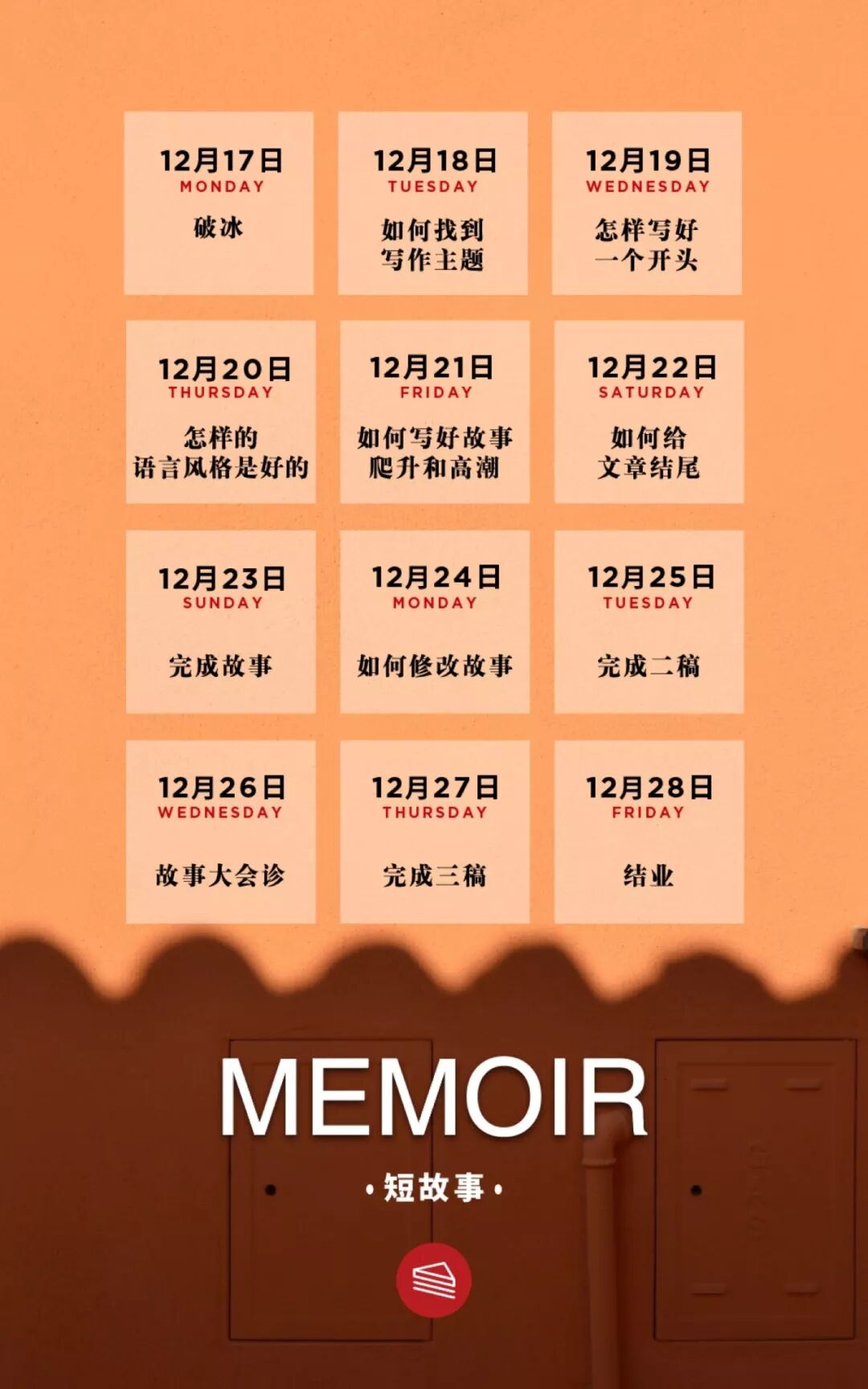 从12月17日,也就是下周一起,导师们将会带领你一步一步完成这个故事,在年末,你可以用一篇精心打磨的作品给自己的2018留下一份特殊的纪念,然后轻装上阵迎接来年。