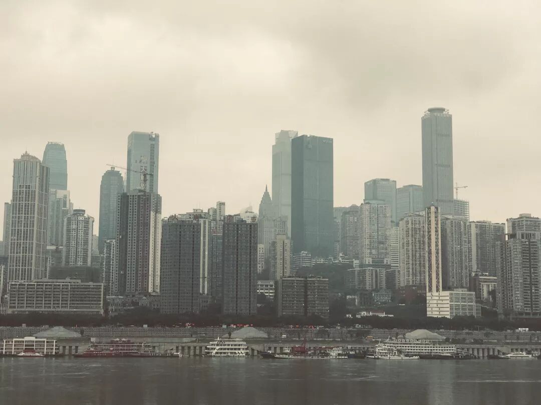 离开之前,我去了江北区的一个公园。对面是繁华的渝中区。天气阴沉,有两位老人拿着手机站在江堤的栏杆边自拍。