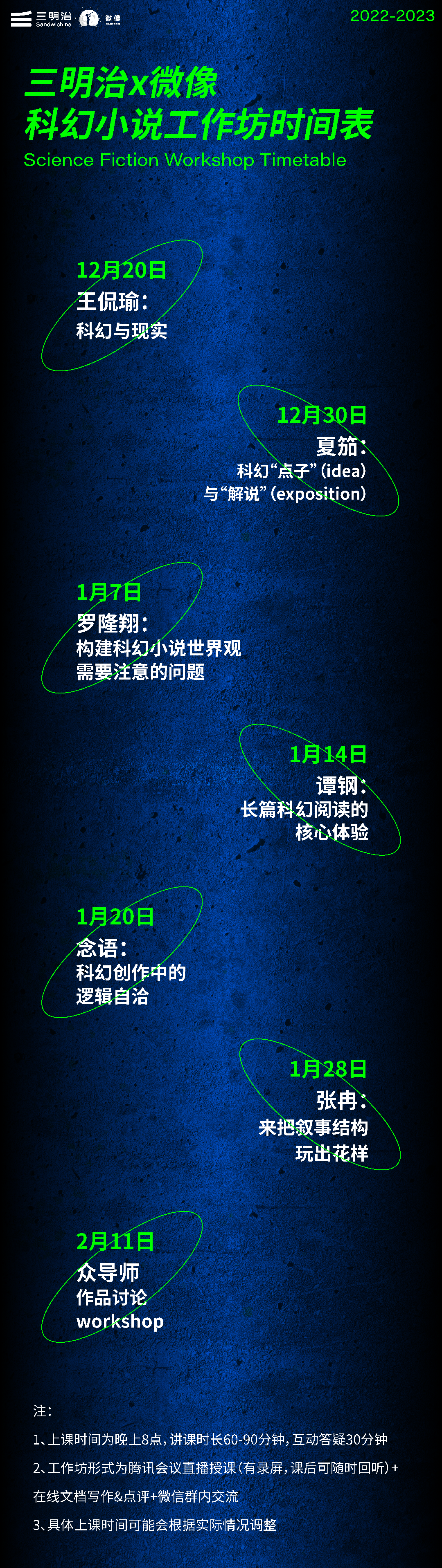 在接下来的两个月里,每周的一个晚上,我们可以聆听科幻作家分享创作经验,每天抽出一点时间,让你脑海中的念头变成完整的故事。短暂抛开现实的烦扰,飞向窗外夜空繁星深处的无垠宇宙。