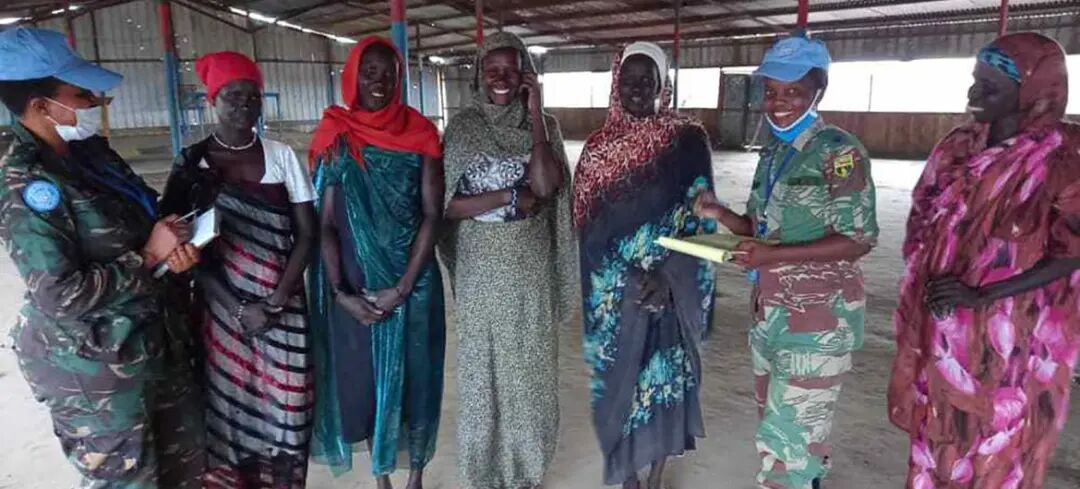 © 联合国南苏丹特派团图片 | 在南苏丹鲁布科纳发生针对拾柴妇女的性暴力和基于性别的暴力事件后,艾琳·威尔逊·穆罗上尉和温妮特·扎拉雷少校(右二)与当地妇女联系,讨论制止虐待的方法。