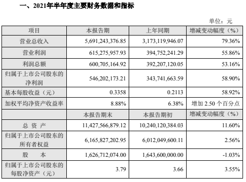 2021年上半年横店东磁实现营业收入约56.91亿元,同比增长79.36%,归属于上市公司股东的净利润约5.46亿元,同比增长58.90%。