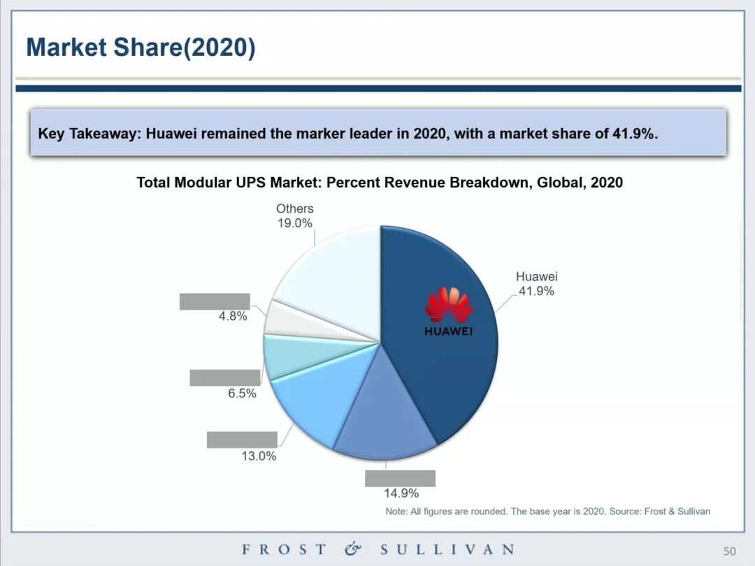 近日,第三方权威咨询机构Frost & Sullivan发布《全球模块化UPS市场报告》,对全球模块化UPS市场动向、市场份额及发展趋势等进行了分析与洞察。其中,报告显示,华为作为模块化UPS的创新引领者,2020年市场份额排名全球第一,持续领跑全球市场。华为又在我们不熟悉的领域,拿下了全球第一。