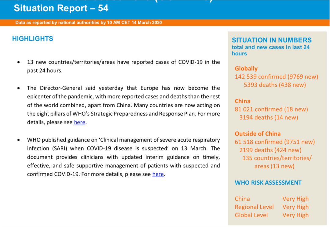 当地时间3月14日,世卫组织发布最新一期新冠肺炎情况每日报告。截至欧洲中部时间3月14日上午10时(北京时间17时),中国以外共135个国家/领地/地区确诊新冠肺炎61518例(新增9751例),死亡共计2199例(新增424例)。据新华社消息,美国约翰斯·霍普金斯大学发布的实时统计数据,截至美国东部时间14日20时(北京时间15日8时),全球新冠肺炎累计病例数已突破15万例。当地时间3月14日18时,意大利民防部门负责人表示,截至目前,意大利累计确诊新冠肺炎病例21157例,较前一天增加3497例,现存新冠肺炎病例17750例,累计死亡1441人。据意大利安莎社报道,意大利卫生部副部长西莱里14日测出新冠病毒呈阳性。同日,意大利教育、大学和科研部副部长阿斯卡尼也在社交媒体上宣布确诊感染新冠病毒。![]()