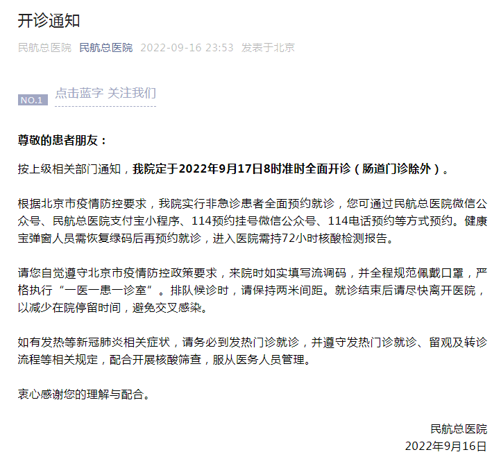9月16日深夜,民航总医院发布消息称,该院于9月17日8时准时全面开诊(肠道门诊除外)。