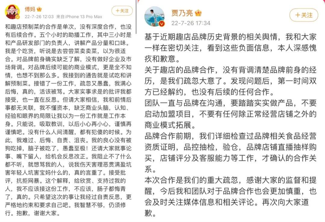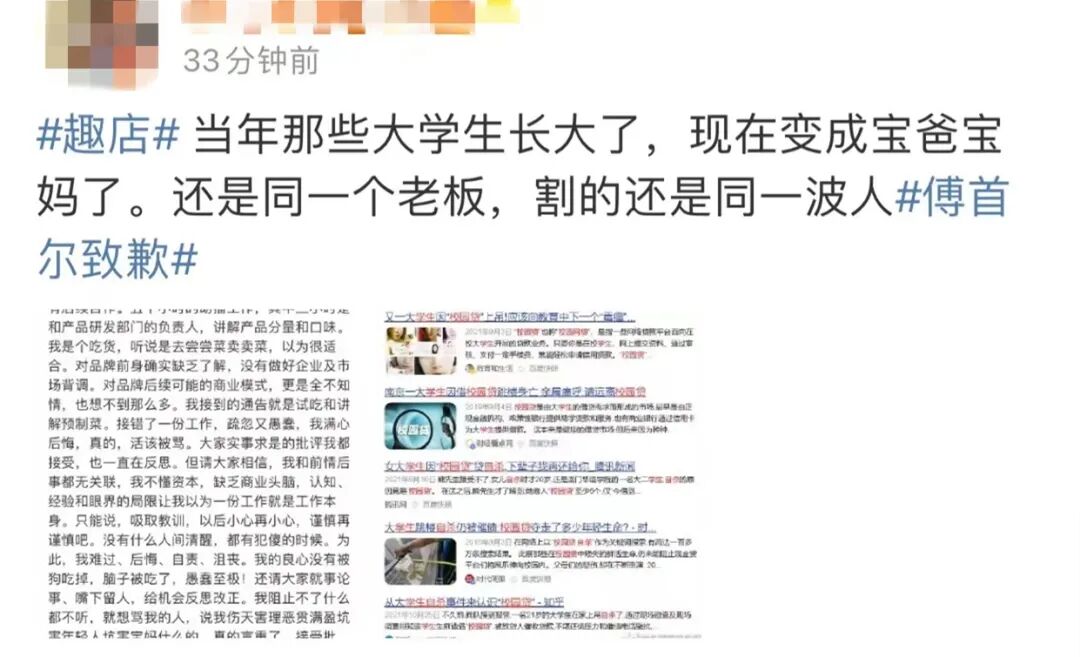曾靠校园贷起家的趣店近日靠直播卖菜火了,但也招来了大量网友的口水。以至于,与趣店合作的明星都急着出来“划清界限”。7月26日,参与趣店预制菜直播的《奇葩说》辩手傅首尔通过其微博账号“傅妈”致歉:“我接到的通告就是试吃和讲解预制菜。接错了一份工作,疏忽又愚蠢,我满心后悔,真的,活该被骂。大家实事求是的批评我都接受,也一直在反思。”同日晚间,演员贾乃亮也发布微博称,“关于趣店的品牌合作,没有背调清楚品牌前身的经历,是我们疏忽大意了。发现问题后,第一时间双方已经解约,也没有后续的任何合作。”网友的大部分“声讨”均指向趣店以往的校园贷业务。