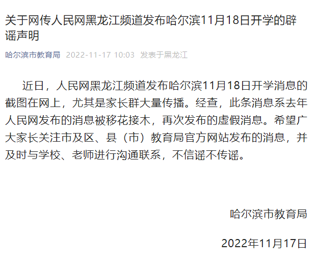 11月17日,哈尔滨市教育局紧急发布“关于网传人民网黑龙江频道发布哈尔滨11月18日开学的辟谣声明”。