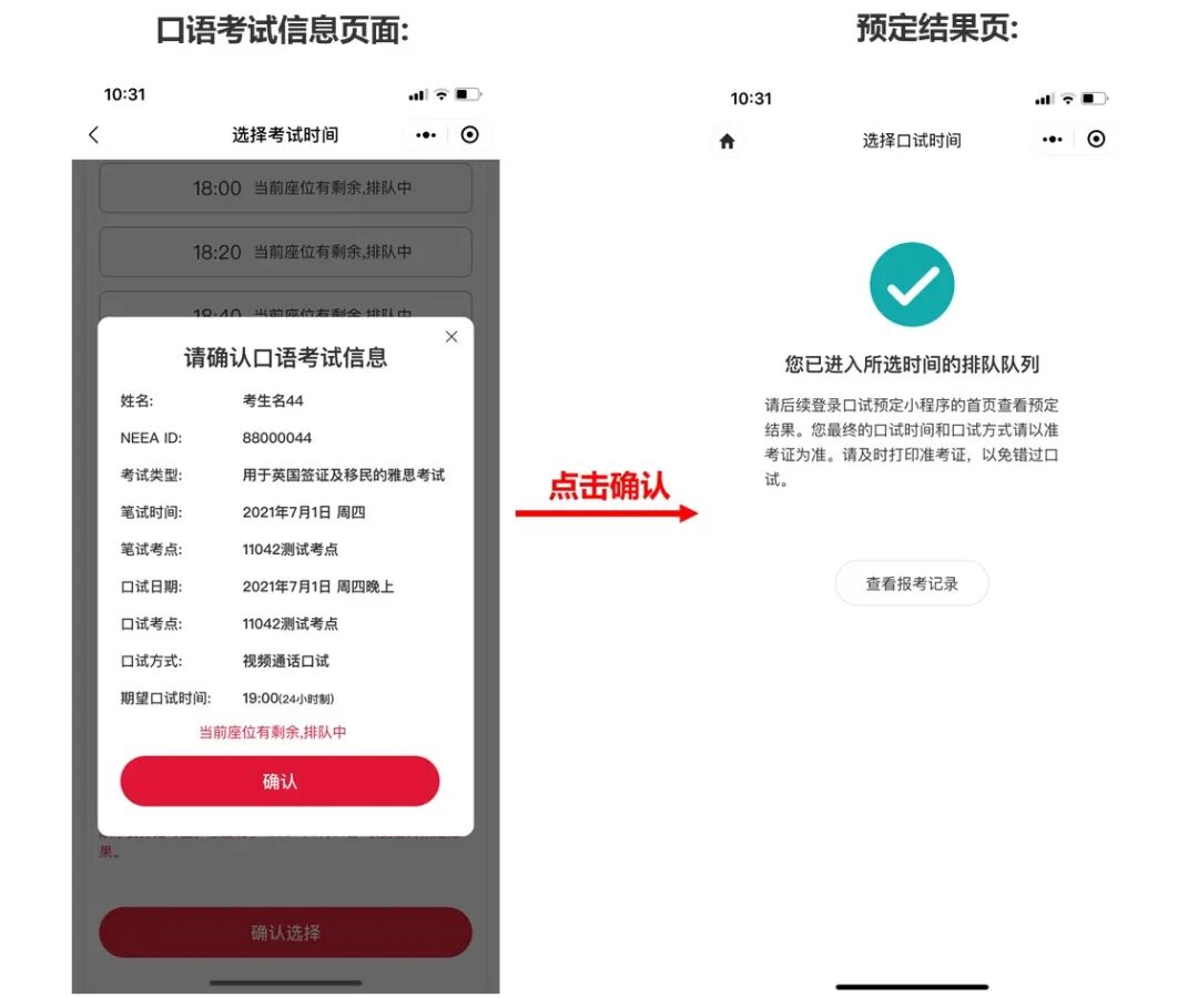 如果你决定继续提交,点击确认,就会进入下面左图中的考试信息确认页面。检查信息无误后,点击确认按钮进入右图所示结果页查看结果。