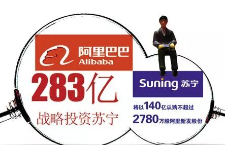苏宁云商以140亿认购2780万股的阿里巴巴新发行股份,持有阿里巴巴1.09%的股份。阿里投资约283亿元参与苏宁的非公开发行,占苏宁总股本的19.99%(18.61亿股),成为苏宁云商的第二大股东。