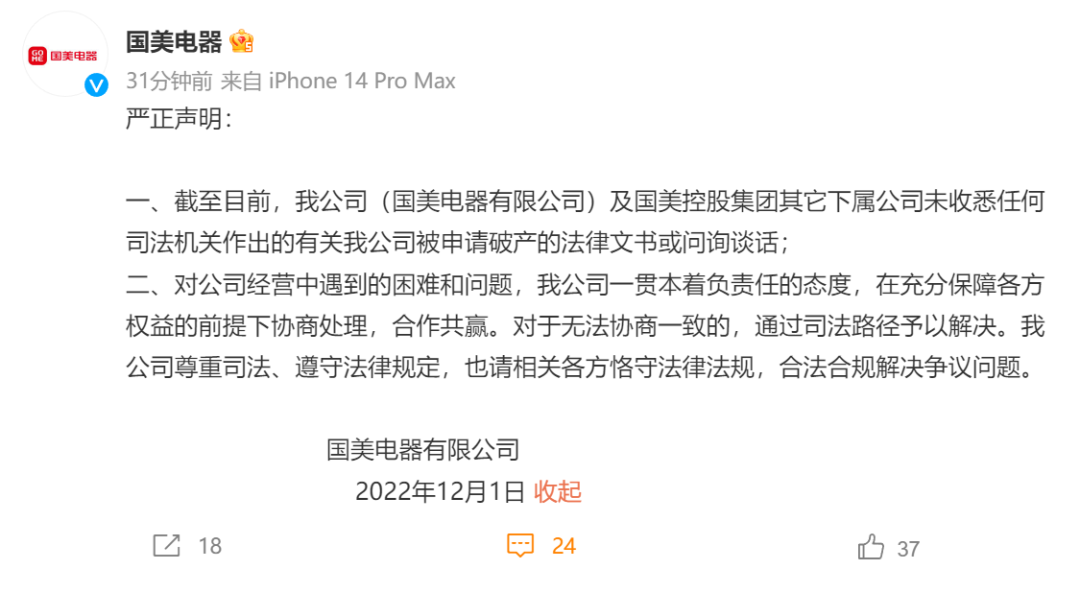 直至当晚,国美电器在官方微博发布声明:截至目前,国美电器有限公司及国美控股集团其它下属公司未收悉任何司法机关作出的有关公司被申请破产的法律文书或问询谈话;对公司经营中遇到的困难和问题,公司一贯本着负责任的态度,在充分保障各方权益的前提下协商处理,合作共赢。对于无法协商一致的,通过司法路径予以解决。公司尊重司法、遵守法律规定,也请相关各方恪守法律法规,合法合规解决争议问题。