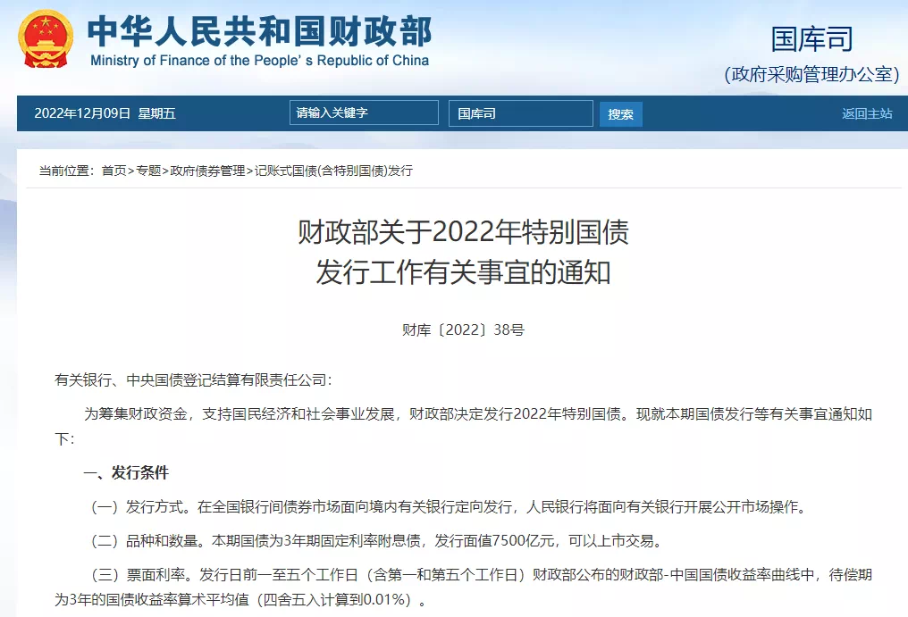 千呼万唤始出来,特别国债终于在2022年末落地。12月9日,财政部官网显示,为筹集财政资金,支持国民经济和社会事业发展,财政部决定于12月12日发行2022年特别国债。本期国债为3年期固定利率附息债,发行面值7500亿元人民币(下同),可以上市交易,发行方式为在全国银行间债券市场面向境内有关银行定向发行,央行将面向有关银行开展公开市场操作。